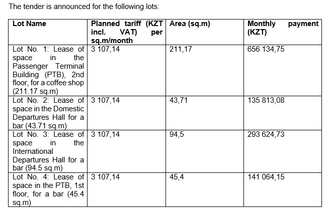 JSC “Sary-Arka Airport” announces a tender for the provision of services on the airport premises not related to airport activities, namely the lease of space starting from 15 (fifteen) square meters to the airport operator for conducting business activities.